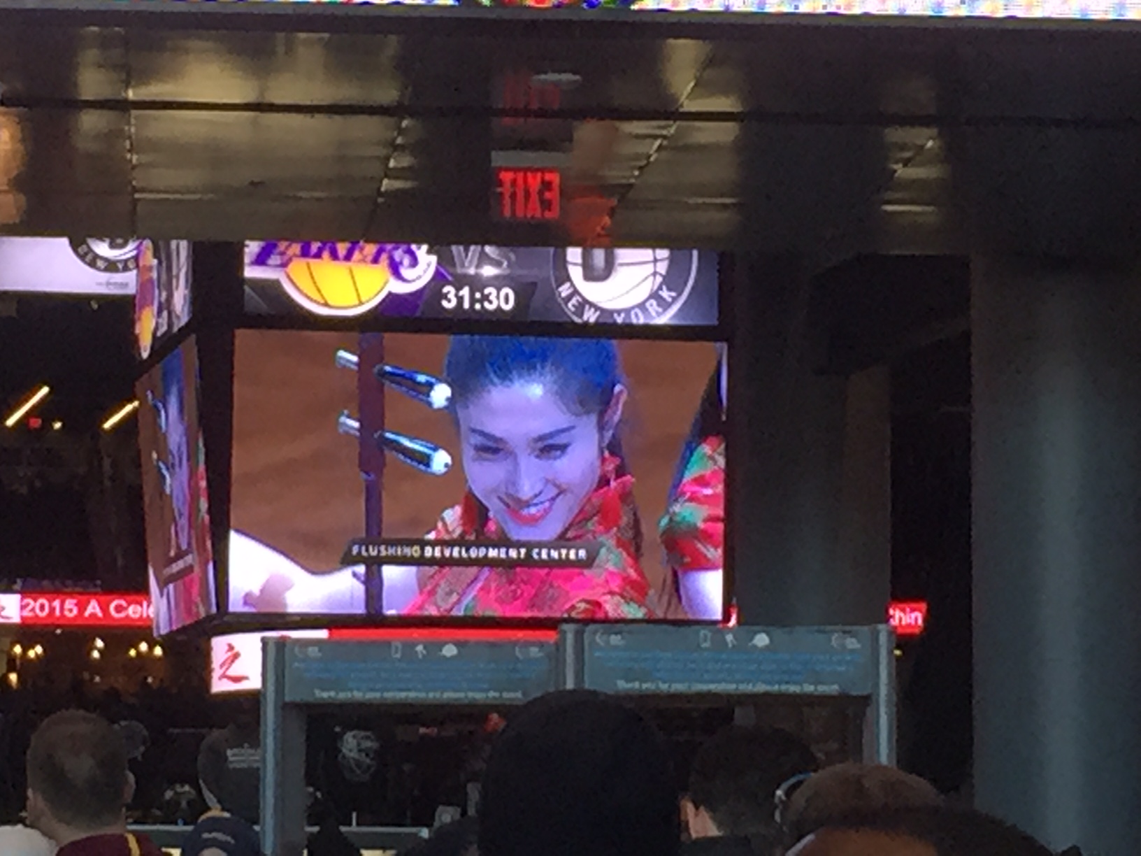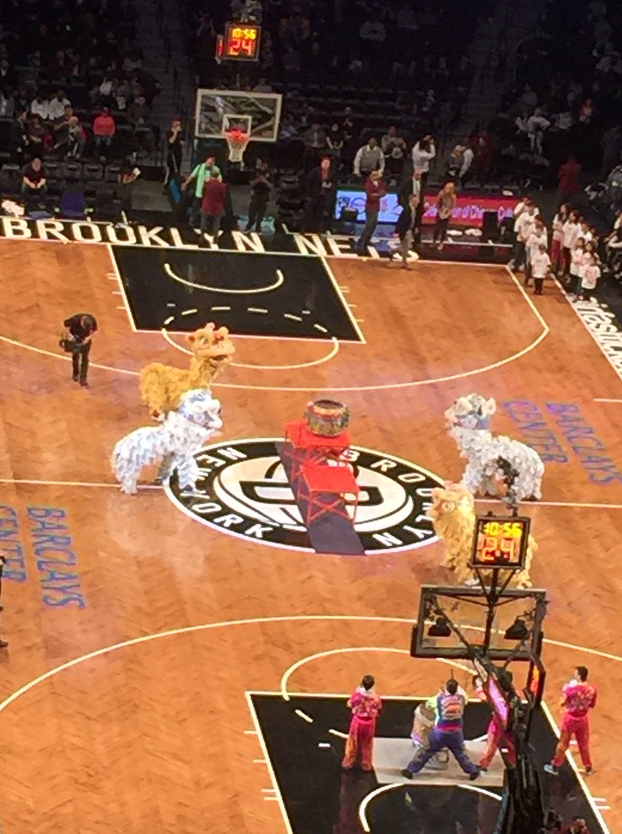 Then came the exciting moment and the two teams were introduced by a male mandarin voice. During the game more Chinese art was introduced such as the lion dance for example. Fan dancing was introduce and the music, performance and all details were all beautiful. Of course, I wish to get a T-shirt with “Ni Hao, Brooklyn” by gun pump. Also, to the disappointment of fans, Jeremy Lin was absent due to sickness.
